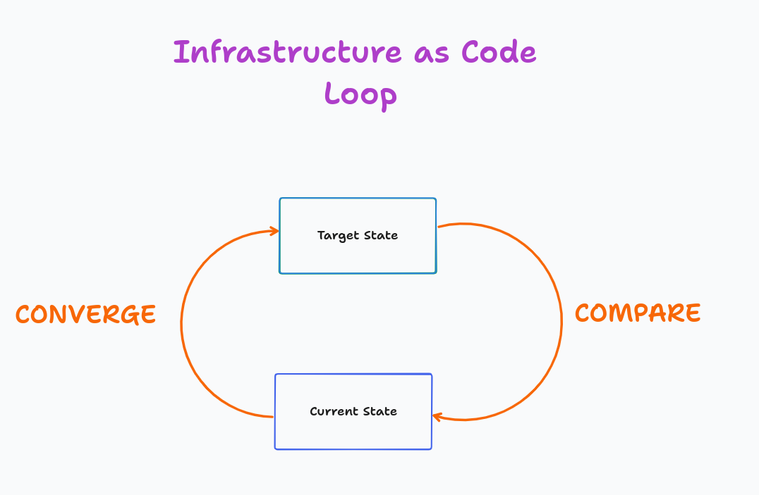 So what exactly is IaC’s core value? It is creating a state machine with 2 states (Current and Target); and 2 interactions (Coverge and Compare).
