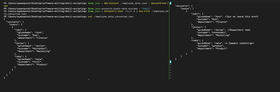 PS powershell-example> $emp_json.accounts.users.neha.surname = "Patil" PS powershell-example> $emp_json | ConvertTo-Json -Depth 4 | Out-File ./employee_data_converted.json