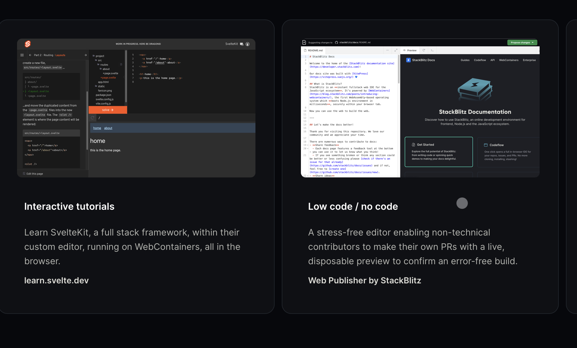 Battle-tested (Sveltekit tutorial uses Webcontainers), this opens up opportunities to make highly interactive web tutorials using the API. Other use cases given on their site include AI applications to run OpenAI directly on the browser as well as No code platforms.